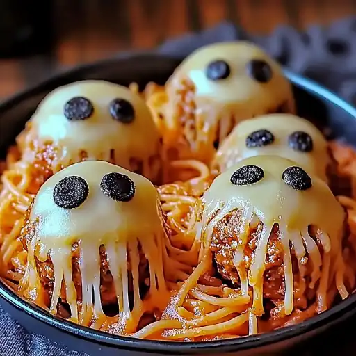 These spooky spaghetti and cheese-stuffed meatballs are a fun and delicious twist on a classic comfort food. Perfect for Halloween or any time you want to add a bit of whimsy to your dinner table, these meatballs are stuffed with gooey mozzarella cheese and served over spaghetti that’s been tinted black or green for an extra eerie effect. The combination of savory meat, melted cheese, and tangy marinara sauce is a guaranteed crowd-pleaser, while the spooky presentation makes them a hit with kids and adults alike.