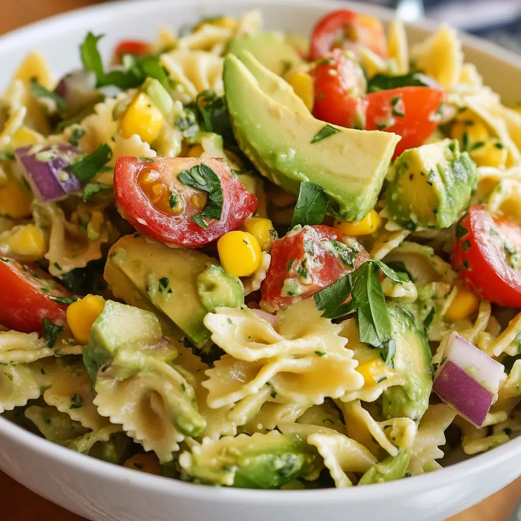 In a large mixing bowl, combine the cooked pasta, diced avocados, cherry tomatoes, red onion, cucumber, corn, and cilantro. Pour the dressing over the salad ingredients and gently toss until everything is coated evenly. Be careful not to mash the avocados too much; you want to maintain some of their texture.