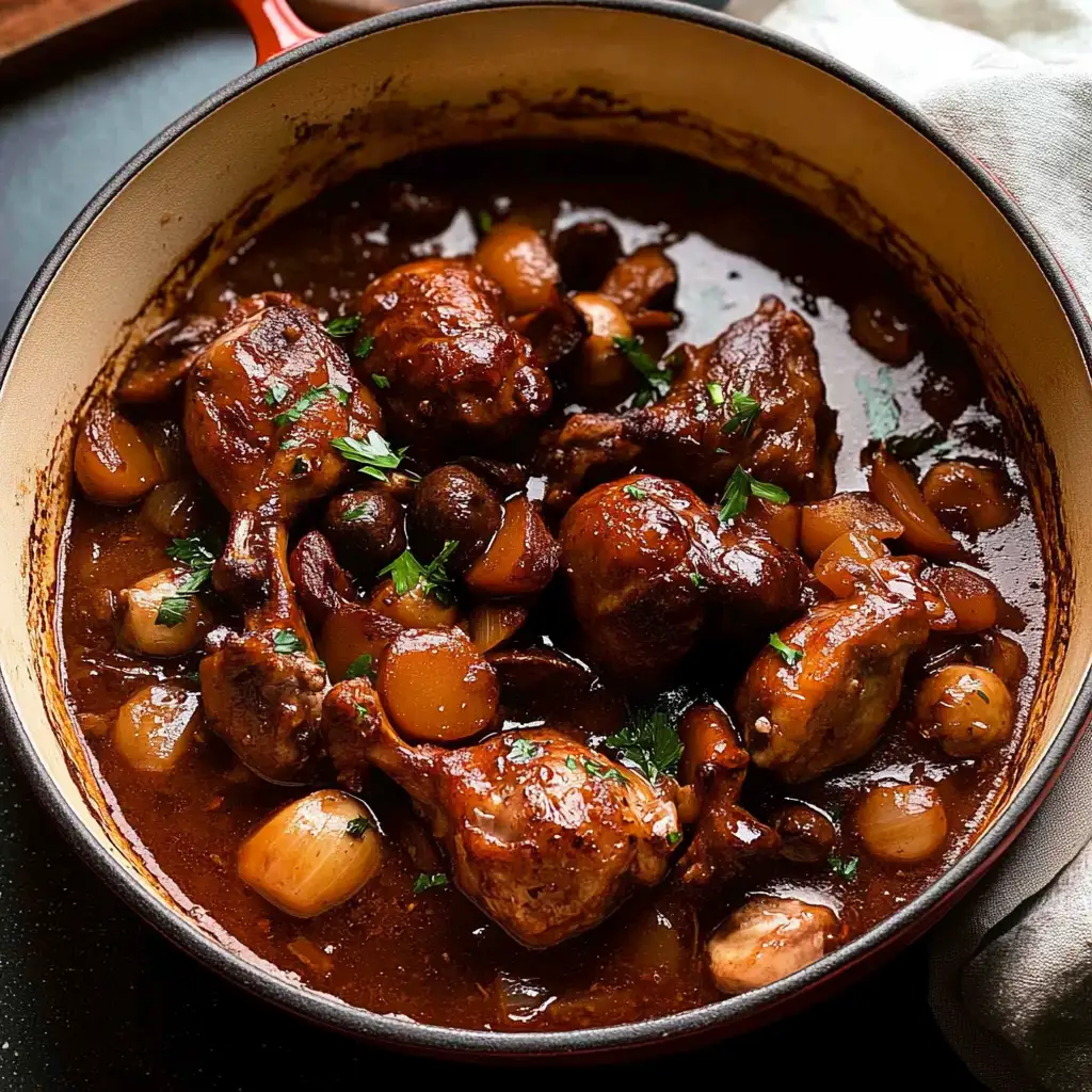 Coq au Vin, translating to “rooster in wine,” is a classic French braise, celebrated for its deep, rich flavors and comforting warmth. This recipe features chicken simmered in red wine with mushrooms, bacon, and pearl onions, creating a dish that’s both rustic and elegant. It’s a culinary journey to the heart of France, perfect for a cozy dinner party or a special family meal.