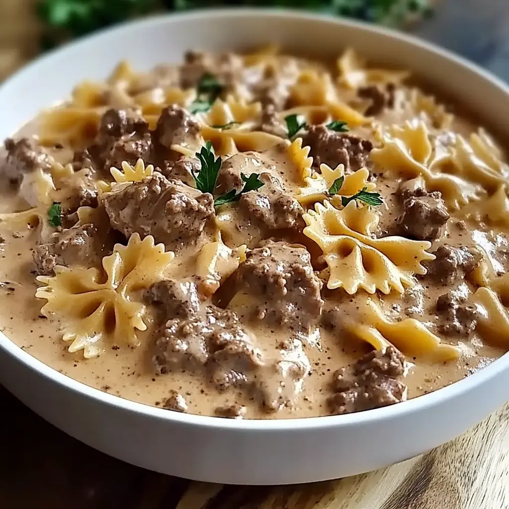 Step 9: Remove the skillet from the heat. Garnish with fresh parsley, chopped, for a pop of color and freshness. Fresh parsley adds a bright, herbaceous flavor that complements the richness of the dish. Serve the Creamy Beef and Bowtie Pasta warm and enjoy!
