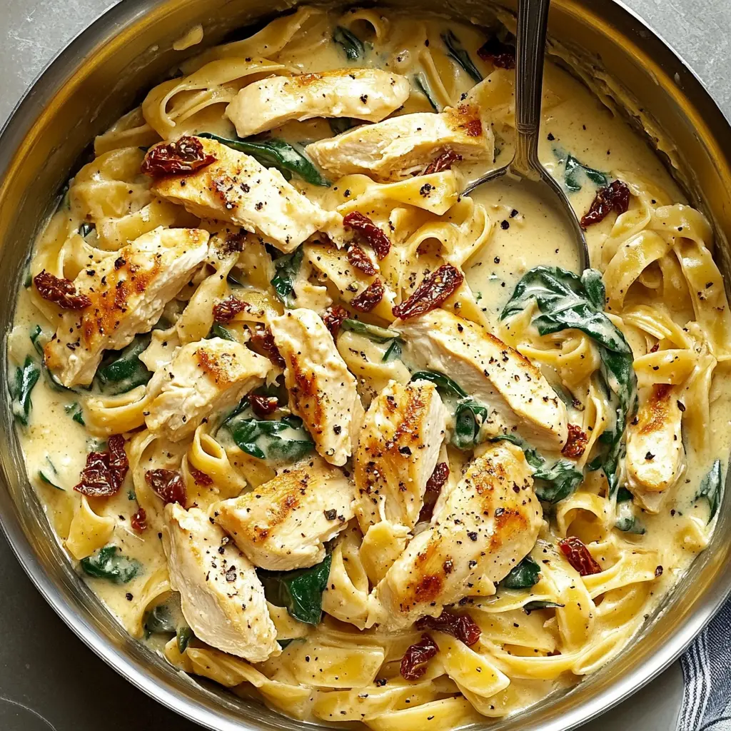 Description of this recipe: This Creamy Chicken Pasta is a comforting and flavorful dish that combines tender chicken, vibrant spinach, and tangy sun-dried tomatoes in a luscious cream sauce. It’s a quick and easy meal that’s perfect for a weeknight dinner or a cozy weekend lunch.