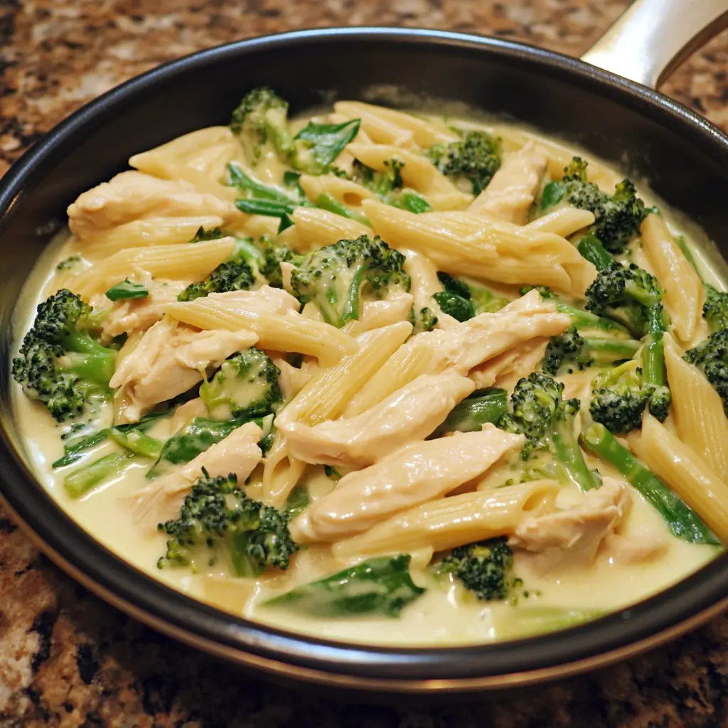 Description: This recipe brings together tender chicken, vibrant broccoli, and perfectly cooked pasta in a luxuriously creamy sauce, all cooked in a single pan for easy cleanup. It’s a family-friendly meal that’s quick enough for a weeknight but satisfying enough for a weekend dinner.