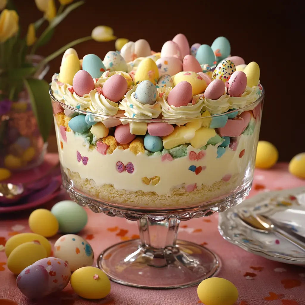 Description: This Easter Trifle is a show-stopping dessert that beautifully combines the light, airy texture of pastel-colored cake, the creamy richness of vanilla pudding, and the ethereal fluffiness of whipped topping. Adorned with mini chocolate eggs, vibrant sprinkles, and delicate edible flowers, it’s a feast for the eyes and a celebration of all things spring.