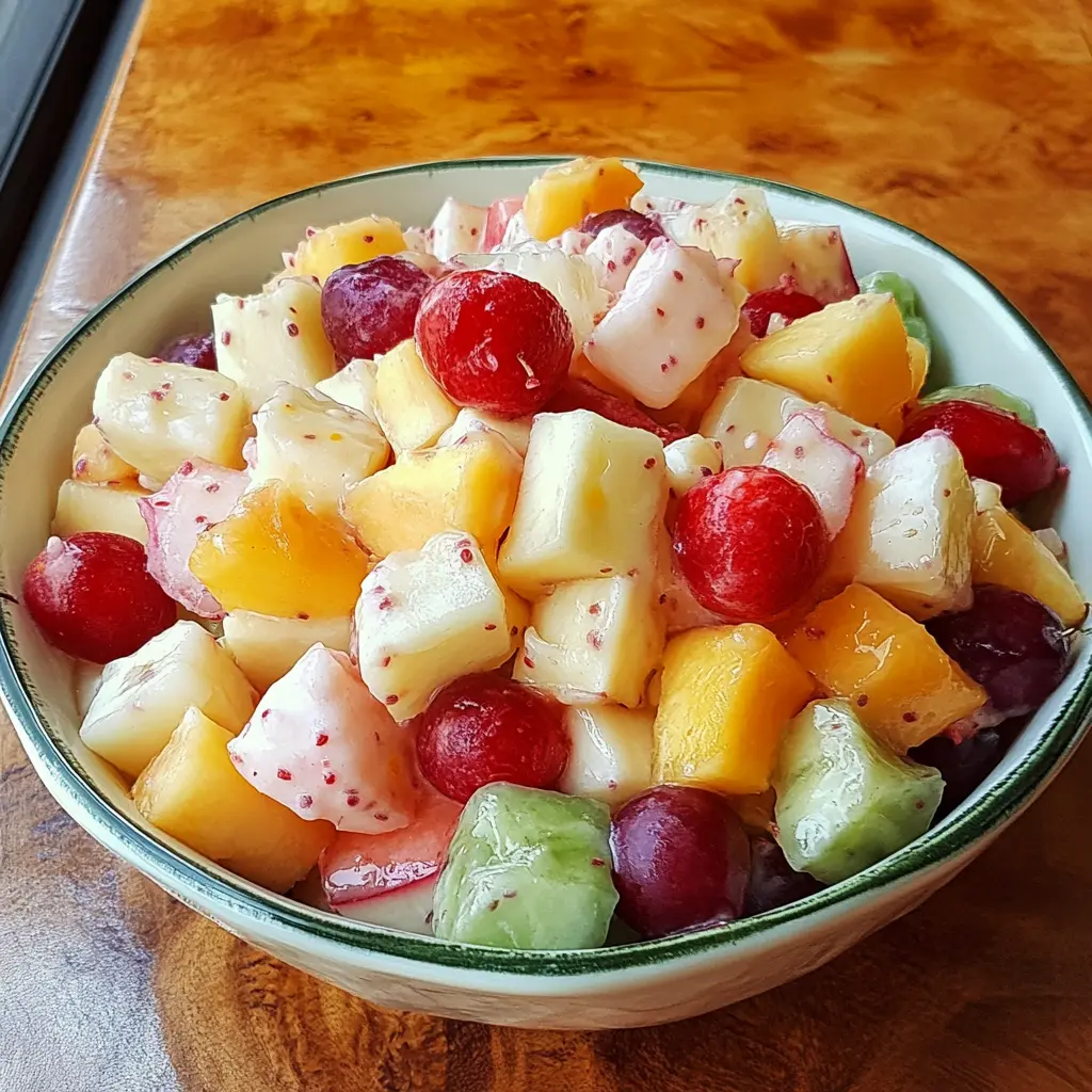 This fruit salad can be served in a variety of ways. For a casual gathering, scoop it into individual cups for easy serving. Alternatively, you can present it in a large glass bowl to showcase the colorful layers. Pair it with grilled meats or serve it as a dessert alongside a slice of cake for a well-rounded meal. It also makes a fantastic breakfast option when served with yogurt or granola.