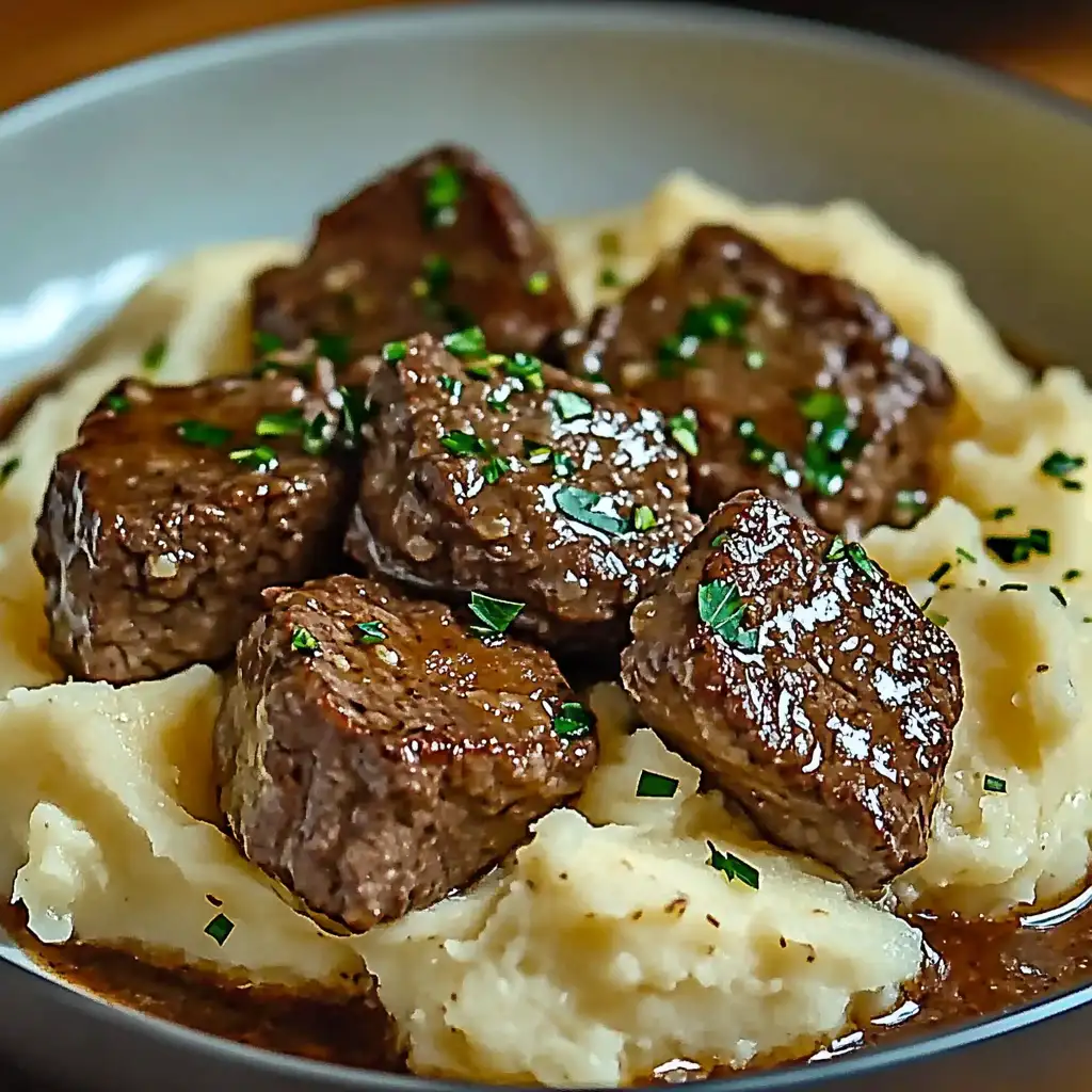 Conclusion: Garlic Butter Beef Bites with Creamy Mashed Potatoes is a dish that truly delivers on flavor and comfort. The tender beef, infused with the aromatic garlic butter, combined with the smooth, creamy mashed potatoes, creates a culinary experience that’s both satisfying and memorable. Whether you’re looking for a comforting weeknight meal or an impressive dish to serve guests, this recipe is sure to become a new favorite. Don’t be afraid to experiment with different variations to make it your own, and enjoy the process of creating something truly delicious.
