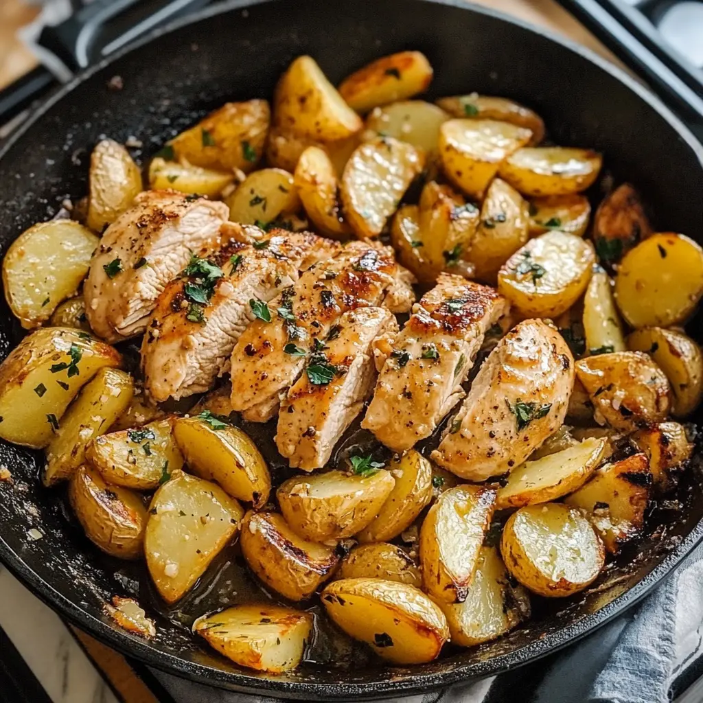 Description of this recipe: This Garlic Butter Chicken and Potatoes Skillet is a one-pan wonder that delivers a flavorful and satisfying meal with minimal cleanup. Tender chicken thighs and perfectly cooked potatoes are bathed in a rich garlic butter sauce, creating a dish that is both comforting and impressive. It’s a weeknight dinner dream and elegant enough for a casual weekend gathering.