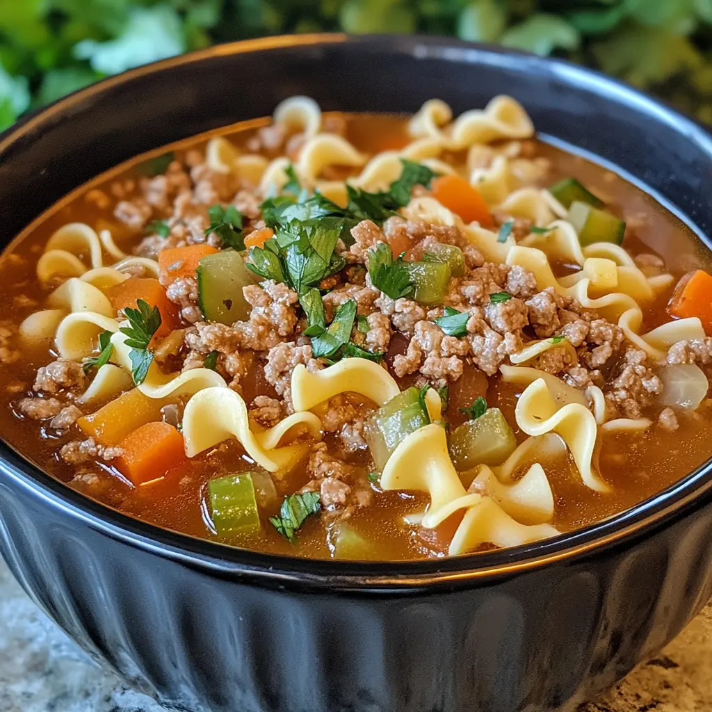 Hamburger Noodle Soup is a hearty and comforting dish that combines the rich flavors of ground beef with tender egg noodles and a variety of vegetables in a savory broth. This recipe is perfect for a cozy family dinner or a quick weeknight meal, providing warmth and satisfaction in every bowl.