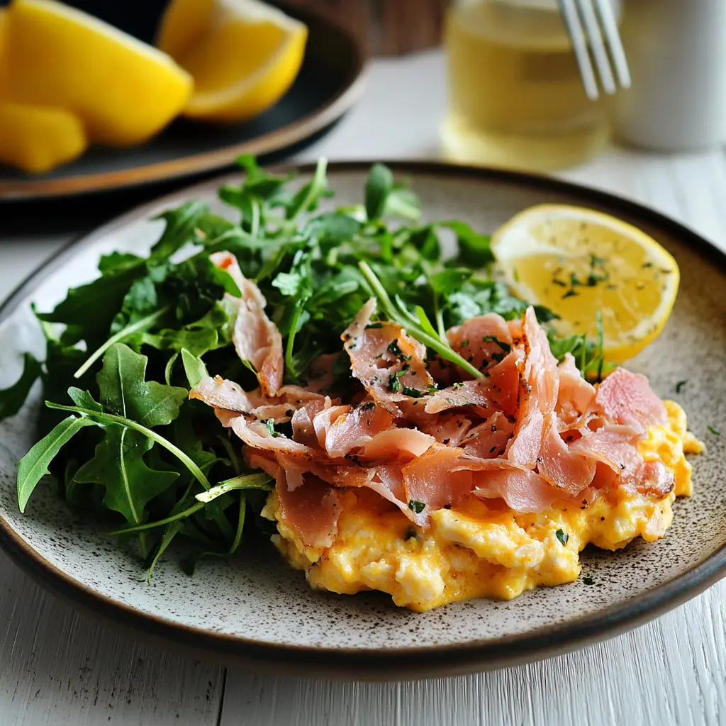 Description: This recipe elevates the classic scrambled eggs into a sophisticated and flavorful breakfast or brunch experience. The creamy, perfectly cooked eggs are combined with the smoky richness of hot smoked trout, creating a delightful contrast that is both satisfying and refined. A vibrant rocket salad dressed with a tangy lemon vinaigrette provides a peppery counterpoint, adding brightness and texture to the dish. Served on toasted dark rye bread, this scramble offers a balanced and delicious way to start your day.