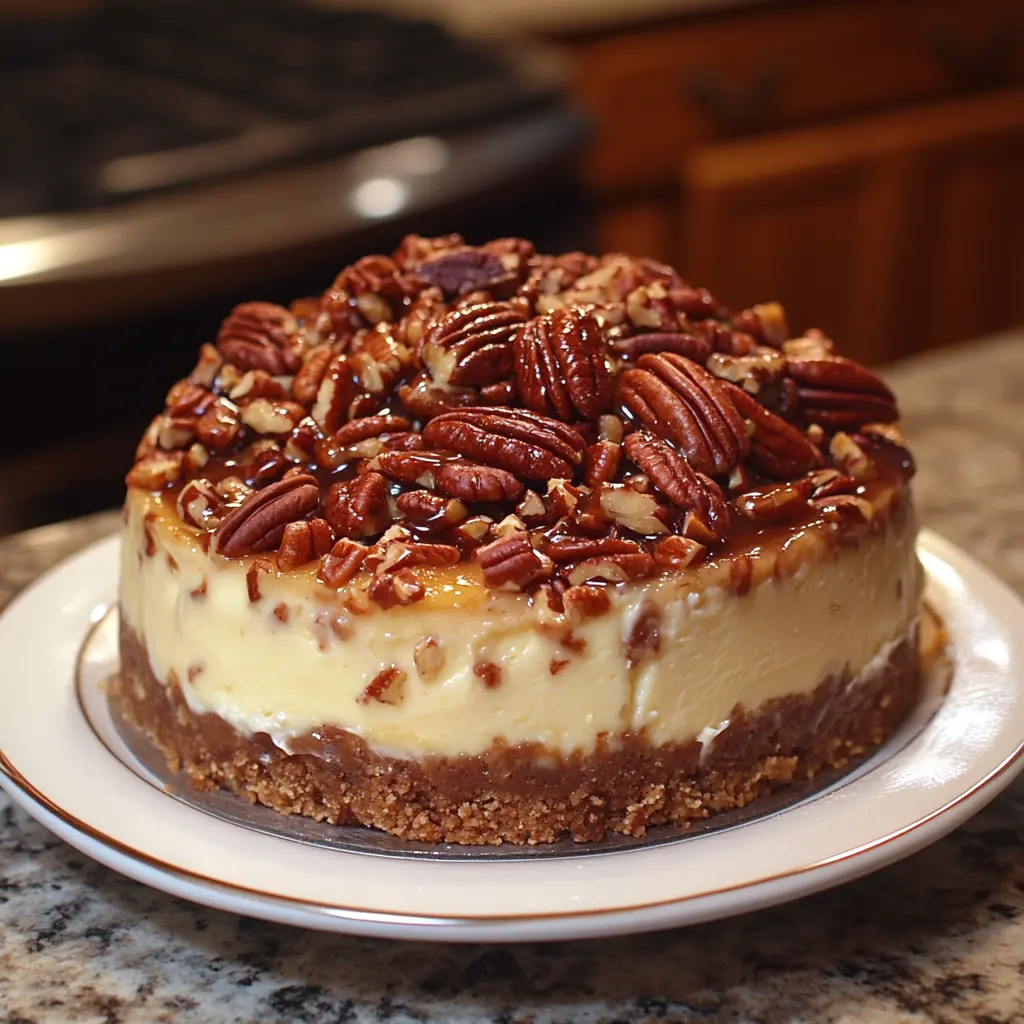 Before serving, decorate the cheesecake with whole pecans on top for an elegant presentation. If desired, add a drizzle of whipped cream for extra sweetness and richness. Slice the cheesecake into wedges, serve, and watch it disappear!