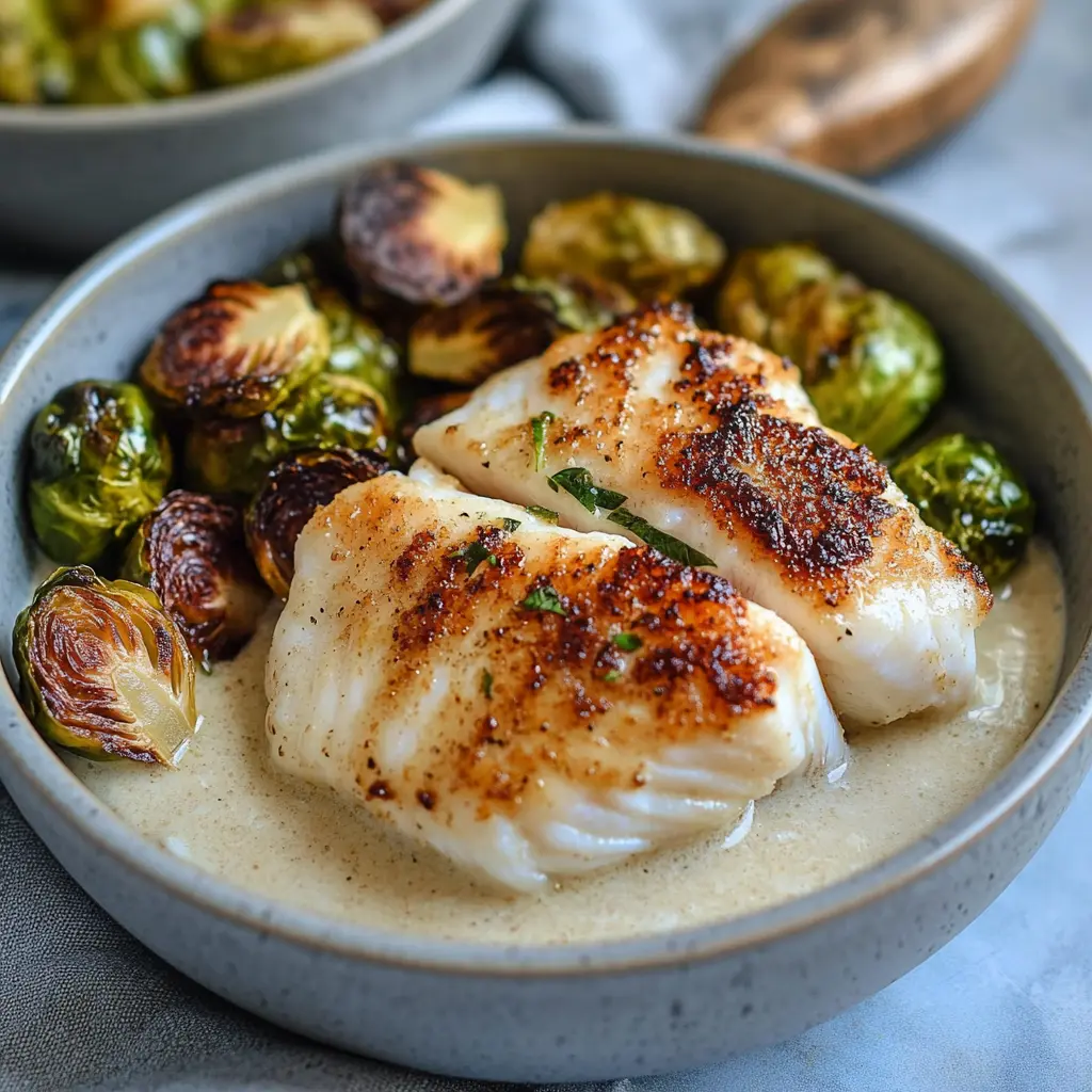 Step 7: To assemble your bowls, divide the roasted Brussels sprouts among serving bowls. Top each bowl with the cooked cod fillets and drizzle generously with the lemon garlic butter sauce.