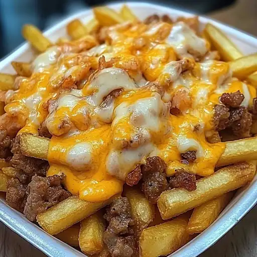 Now comes the fun part! Spread the crispy fries on a large serving plate. Be generous, creating a mountain of golden goodness. Evenly distribute the cooked ground beef over the fries, followed by the succulent shrimp. Ensure that every bite is loaded with both surf and turf. Sprinkle the grated cheddar cheese generously over the beef and shrimp.