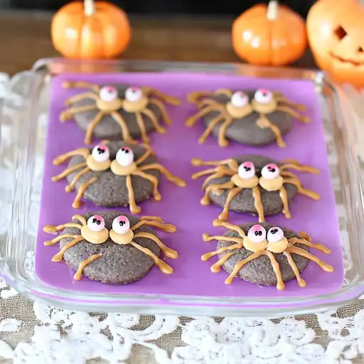 Flip the cookies over so that the pretzel legs are facing down. Cut the tips off each of the 24 spice drops to expose the sticky base. These will serve as the spider’s eyes. Gently press two spice drop bases onto the front of each cookie to create the eyes. The sticky surface of the spice drops should adhere easily to the fudge.