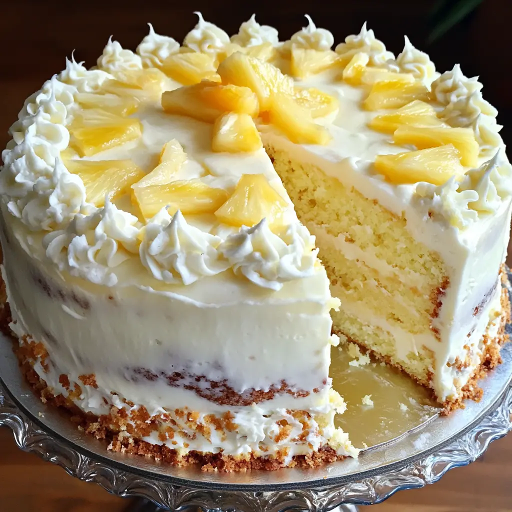 The cake itself is light and fluffy, thanks to the perfect balance of ingredients. Each layer is infused with crushed pineapple and shredded coconut, creating a moist texture that melts in your mouth. The cream cheese frosting adds a rich, tangy contrast that elevates the cake to a whole new level of deliciousness. And let’s not forget the stunning presentation—garnished with fresh pineapple chunks and toasted coconut flakes, this cake is as beautiful as it is tasty.