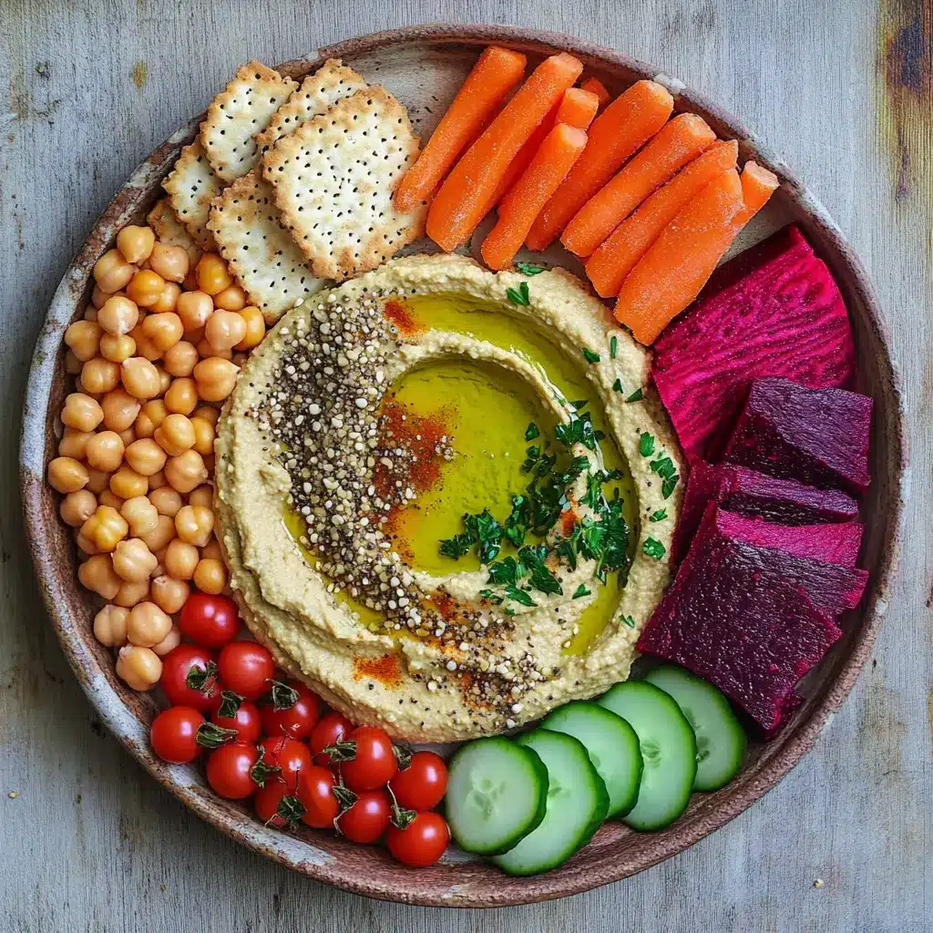 Description: This vibrant Rainbow Hummus Plate is more than just a snack; it’s a culinary canvas painted with healthy and delicious ingredients. Creamy, homemade hummus sits alongside earthy beetroot hummus, surrounded by a colorful array of crisp vegetables, crunchy crackers, and a zesty chickpea salad. It’s a feast for the eyes and a party for your taste buds, perfect for sharing or enjoying as a light and satisfying meal.