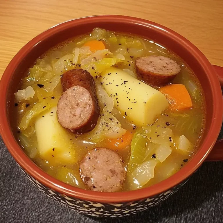 This Sauerkraut Sausage Soup is a comforting and flavorful dish perfect for a chilly day. Combining the tangy zest of sauerkraut with the savory richness of beef kielbasa sausage, this soup delivers a delightful blend of textures and tastes. The addition of hearty vegetables like potatoes, carrots, and celery makes it a complete and satisfying meal.