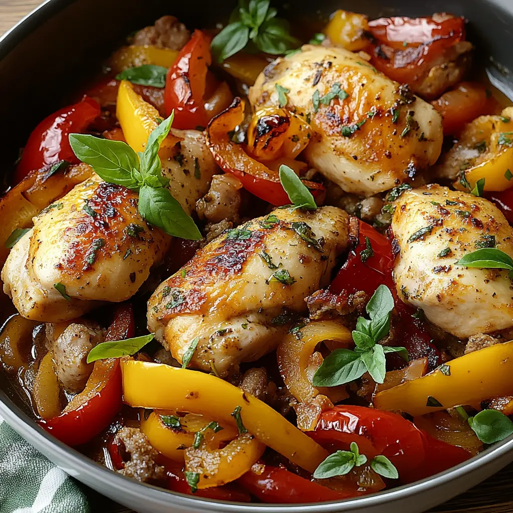 Description of this recipe: This vibrant and flavorful Italian chicken dish combines tender chicken breasts with colorful bell peppers, onions, garlic, and your choice of savory meat. The dish is seasoned with classic Italian herbs and finished with fresh basil, offering a delightful Mediterranean-inspired meal.