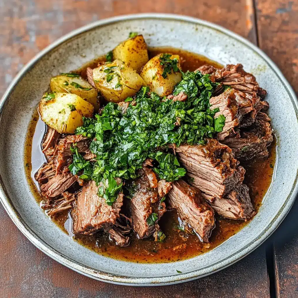 The addition of crispy fried potatoes takes this dish to another level of indulgence. Their salty, crunchy texture complements the tender beef and the fresh chimichurri, creating a truly unforgettable culinary experience. This is more than just a meal; it’s a celebration of flavor and texture, perfect for sharing with loved ones or savoring on a quiet evening. The slow cooking also ensures that the flavours meld together beautifully, making each bite an explosion of taste. Don’t be intimidated by the cook time; most of it is hands-off, allowing you to relax and enjoy the anticipation of the delicious meal to come.
